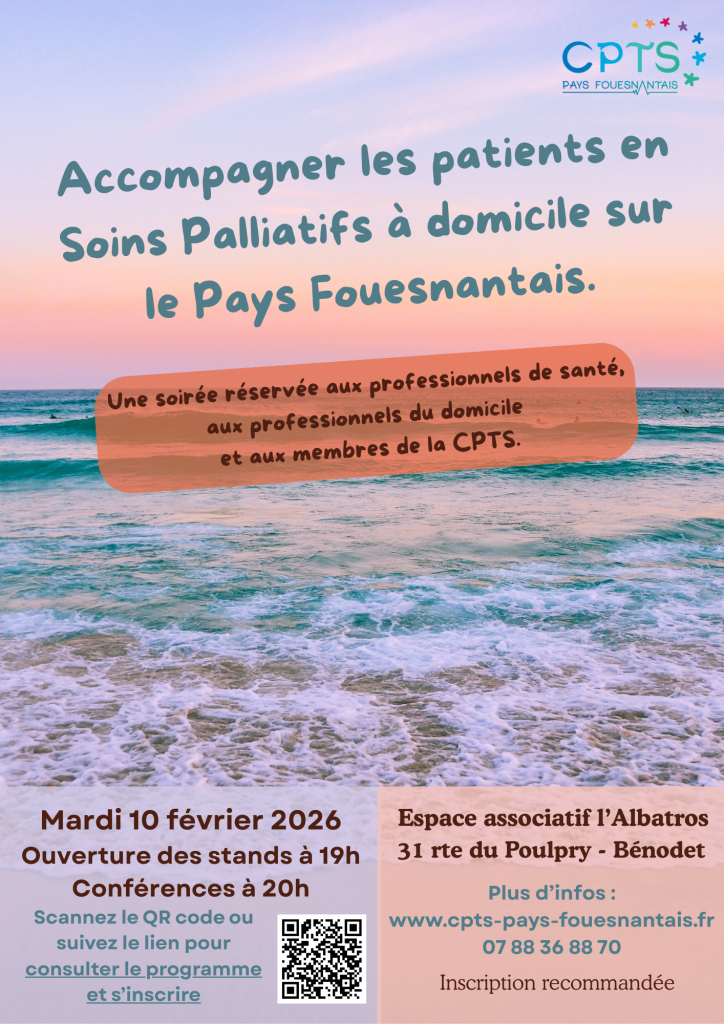 Le groupe de travail « Accompagner la fin de vie » est heureux d’inviter les professionnels de santé, les professionnels du domicile ainsi que les membres de la CPTS à une soirée d’échanges et de rencontre sur les soins palliatifs à domicile.