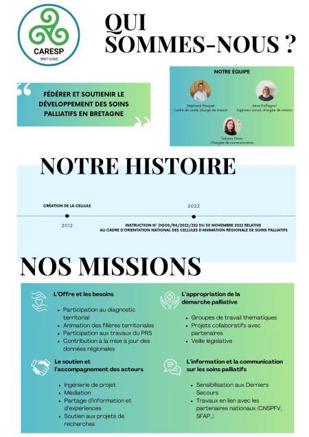 Créée en Mars 2012, la Cellule d’animation régionale des soins palliatifs (CARESP) est le résultat des réflexions menées conjointement sur la question de l’organisation régionale des soins palliatifs par l’Agence Régionale de Santé et par la Coordination Bretonne de Soins Palliatifs (CBSP).